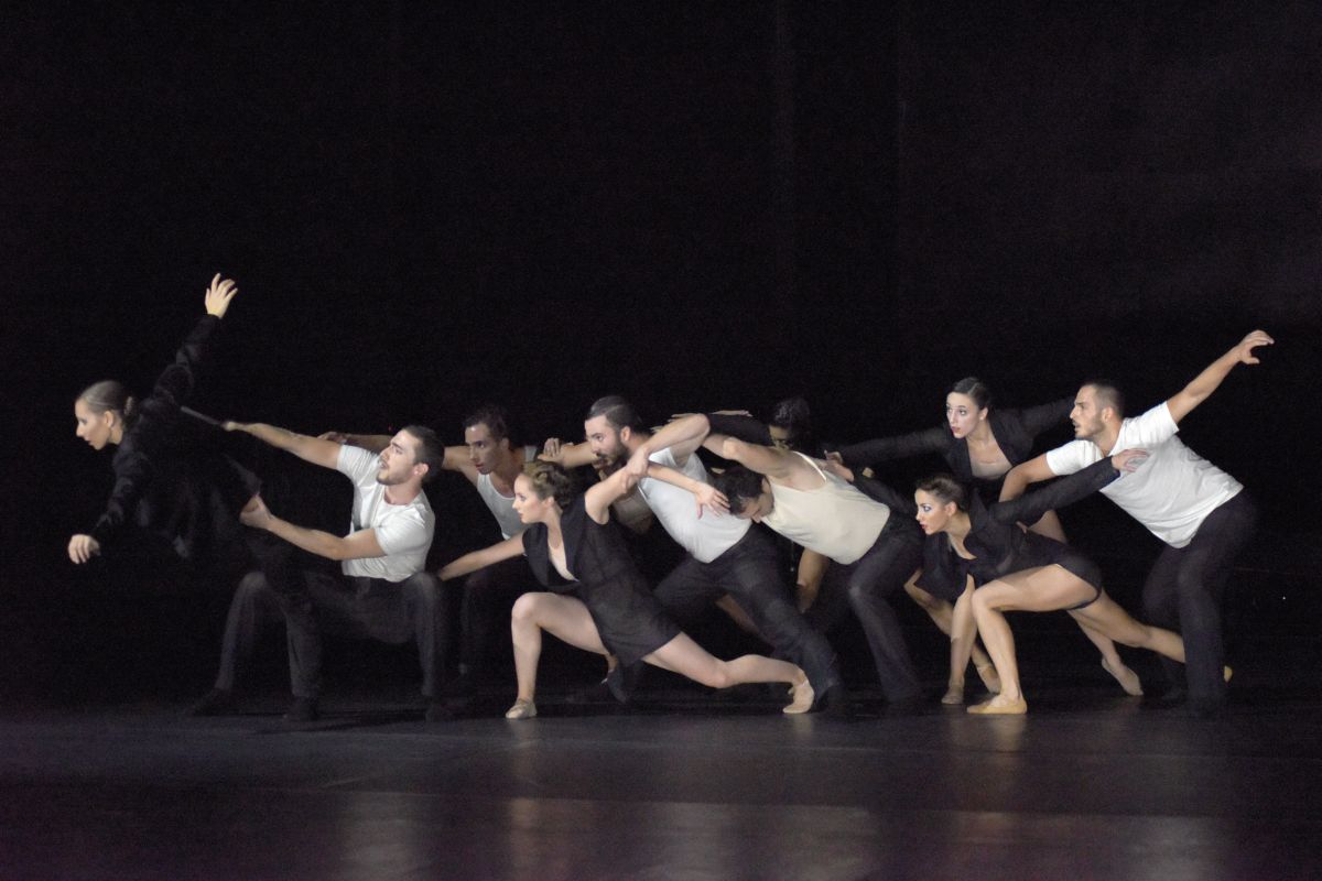 Richard Siegal hat mit seiner Produktion „Liedgut“ sicher eine originelle Idee verfolgt. Bei ihm steht der moderne Mensch als Maschine im Vordergrund. Dazu hat er eine große Lichtstele in die Mitte der Bühne stellen lassen, die ein wenig an Kubricks Film „2001“ erinnert. Auf dieser Stele werden abwechselnd „weißes Rauschen“ – etwa wie bei einem Fernseher ohne Programm – oder Signale dargestellt. Die können aus Wellenlinien wie auf einem Oszillographen – natürlich der Intensität der Musik folgend – oder als Buchstaben wie auf einem Computerbildschirm bestehen. Das Ganze ist akustisch mit verzerrten Tonsignalen – Rauschen, verzerrte menschliche Stimmen oder Musik – unterlegt. Wenn die Stele sich nach gefühlten Minuten hebt und in der Luft langsam dreht, kommen unter ihr die Tänzer und Tänzerinnen zum Vorschein. Sie tanzen anfangs in weißen, lack-glänzenden Kostümen auf. Später, zu invertierten Signalen auf der Stele – Weiß wird Schwarz und Schwarz wird Weiß – treten sie dann in schwarzen Kostümen auf. Man kann dieses Wechselspiel zwischen Weiß und Schwarz natürlich mythologisch oder moralisch deuten, doch die Tanzfiguren geben zu solchen Spekulationen keinen Anlass. Zu Techno-Sounds aus elektronischen Quellen tanzt die Truppe vor allem Formationen. Eine Geschichte wird nicht erzählt, denn die Botschaft lautet: mit der Mutation des Menschen zur Maschine ist das Ende der Geschichte erreicht. Auch das nur eine Spekulation, die sich zwar anbietet aber nicht aufdrängt.
