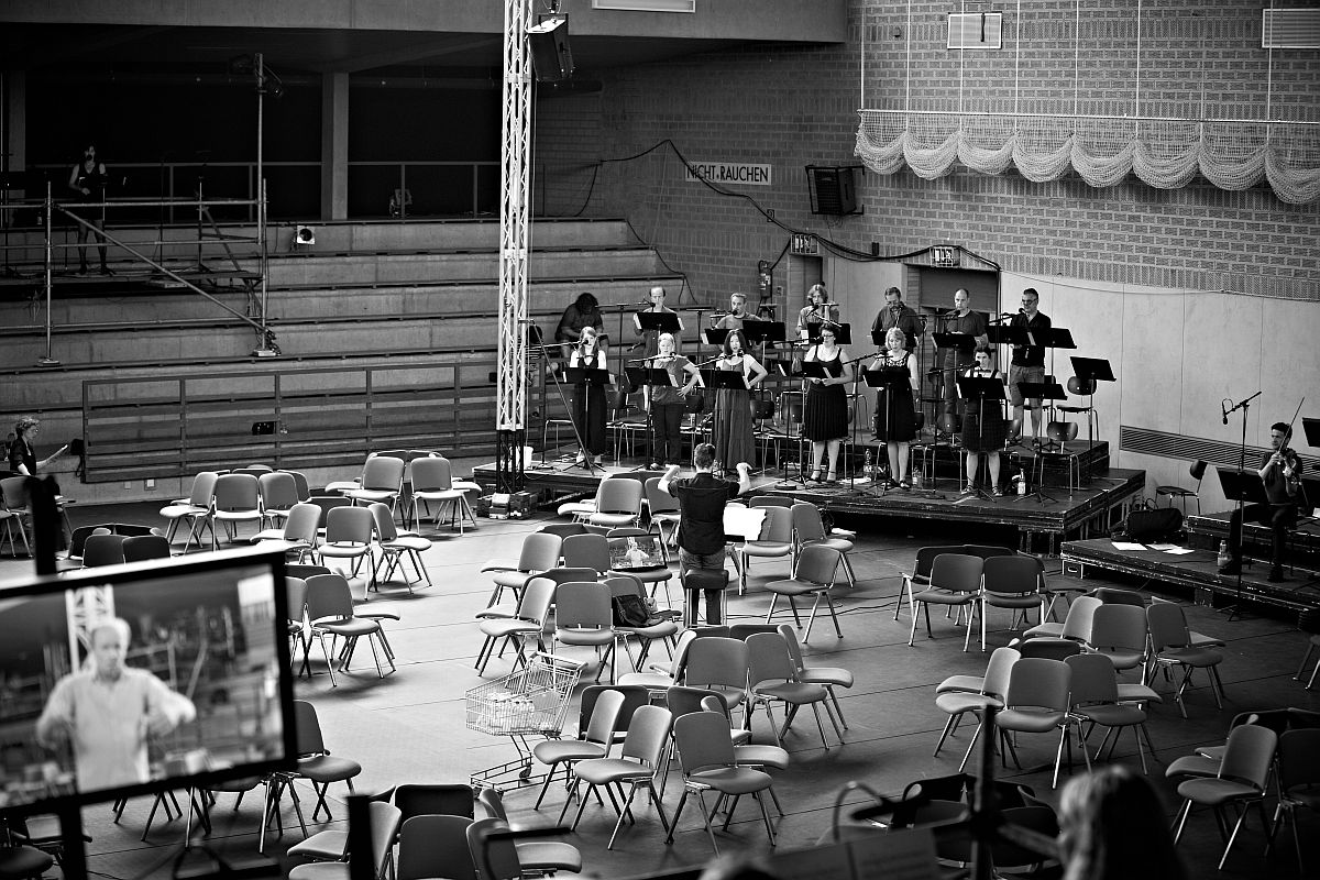 Bereits die viertelstündige Wartezeit im Dunkeln führte in die Welt des Klangs ein und ermöglichte es, sich darauf zu konzentrieren, wenn man es ernst nahm. Denn nach Abnehmen der Augenklappe ist man sofort den optischen Eindrücken der Halle, des Publikums, der Anordnung der Musiker, der vorbereitenden Tätigkeiten der Dirigenten und der Unterstützung der Statisterie ausgesetzt, so dass man schnell die vermeintlich unwesentlichen akustischen Eindrücke verdrängt. Doch gerade das sollte vermieden werden. Wir können den Zuschauern der nächsten Vorstellungen also nur empfehlen, die Augenklappen nicht nur während des Gangs zum Platz, sondern auch bis zum Beginn der Musik und mindestens während des Prologs aufzubehalten. Man gewinnt so einen ganz anderen Zugang zu der Welt des Klangs, als wenn man sich währenddessen den visuellen Eindrücken aussetzt. Der Rezensent behielt seine Augenklappe während nahezu der gesamten Veranstaltung auf und nahm sie nur kurz zu den Platzwechseln in den Pausen zwischen den einzelnen „Sätzen“ des Werks ab. Diese zyklischen Platzwechsel um zwei Sitze dienen dem Zweck, einen anderen akustischen Zugang zu der Musik zu gewinnen: was man eben von vorne gehört hat, erklingt nun von der Seite, was von dort kam, kommt nun von hinten. Jeder Platzwechsel führt zu einem neuen Eindruck der gesamten musikalischen Wirkung, da die verschiedenen Instrumental- und Vokalgruppen ihre Stellung beibehalten und sich der der Klangraum für den einzelnen Zuhörer damit jedes Mal ändert.