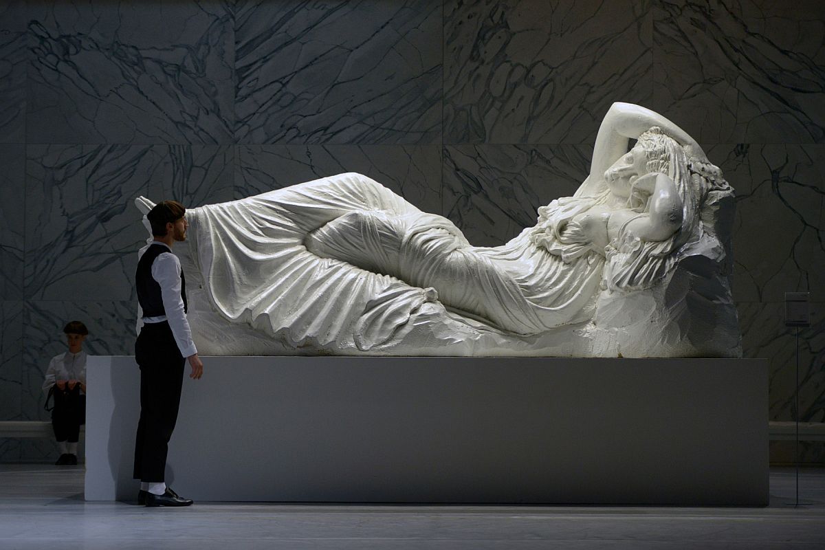 Dann hebt sich der Gazevorhang, und dahinter wird eine überlebensgroße liegende Ariadne sichtbar, deren weißer (Theater-)Marmor eine geradezu blendende Wirkung ausübt – die Metapher der blendenden Kunst. Um diese Statue tanzen zu Kunstfiguren stilisierte Personen in maßvollen, sich selbst ästhetisierenden Figuren. Während ätherische Klänge durch die Luft schweben, ertönen plötzlich durch eine schwere eiserne Tür an der Bühnenwand hässliche Töne, die Gewalt und Unfrieden verheißen. Obwohl die Gemeinschaft der Künstler deutlich ihre Irritation zeigt, überwiegt die Neugier, und bald schon rütteln einzelne Personen an der Tür und fordern laut schreiend in mehreren Sprachen die Öffnung. Als sich die Tür einmal öffnet, erweckt die Sicht nach außen offensichtlich Schrecken und Erstarrung. Und doch wirkt diese einmalige Öffnung wie der Anblick des paradiesischen Baumes der Erkenntnis. Die Neugier nach dem „Draußen“ und das Gefühl der Isolation treibt die Künstler zu immer stärkeren Ausbrüchen und Trommelattacken auf die Tür. Dabei stellt sich auch eine unfreiwillige Komik ein, wenn die Gruppe versucht, mit einer Art Rammbock die Tür zu öffnen, die sich gemäß der Öffnungserfahrung nach innen öffnet….