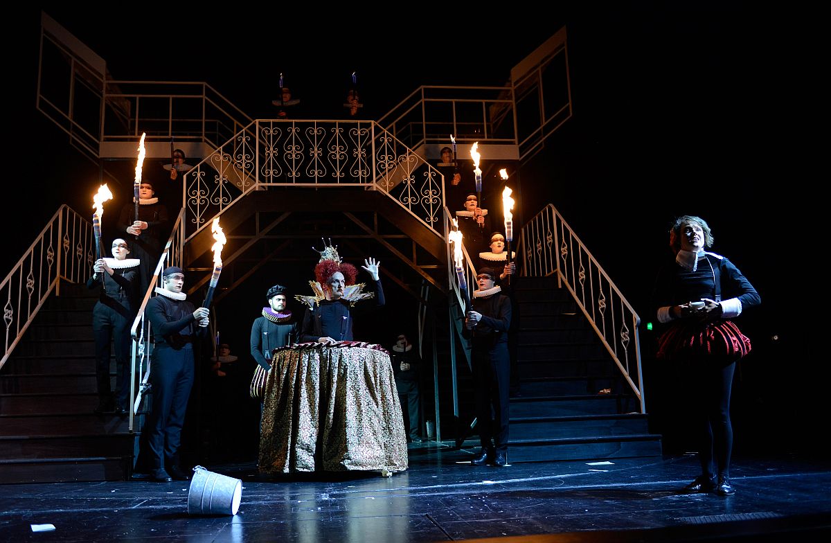 Die britische Regisseurin Lily Sykes hat diesen „Gender“-Roman als metaphorisches Spiel archetypischer Figuren auf die Bühne gebracht. Bühnenmeister André Lange hat ihr dazu ein Bühnenbild geschaffen, das im wesentlichen aus einem die Bühne füllenden, symmetrischen Gerüst aus transparenten Treppen und Galerien besteht. Dieses Gerüst stellt mal Orlandos weitläufigen Landsitz in England, mal den Palast der englischen Königin oder auch ein Schiff dar. Die jeweilige Bedeutung erhält es ohne große bauliche Zusätze hauptsächlich aus dem Kontext des Geschehens und den Worten der Protagonisten. Hin und wieder ergänzen Schwaden von Disconebel das metaphorische Ambiente. Die Kostüme von Silke Ehrhard orientieren sich ansatzweise an den durchwanderten Jahrhunderten, wobei vor allem der breit ausladende Reifrock als Zeichen für die zur Bewegungslosigkeit verdammten Frauen eine zentrale Rolle spielt.