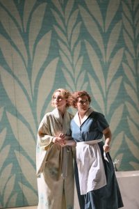 Diesen Hauch gelangweilter Dekadenz verströmt nicht nur David Pichlmayer als Almaviva, sondern auch Katharina Persicke als Gräfin. Das wird besonders deutlich, wenn sie sich in der Badewanne räkelt und vor Langeweile nicht weiß, wohin mit dem langen Tag. Regisseurin Emmanuelle Bastet legt beide Figuren bewusst als überreife Früchte einer verblühenden Epoche an, was sich natürlich mit dem historischen Wissen der Nachgeborenen leicht gestaltet. Doch sie versucht nicht, die Personen im Sinne klassenkämpferischer Agitation zu denunzieren. Der Regisseurin geht es nicht darum, mit dieser Inszenierung eines Klassikers offene gesellschaftspolitische Türen einzurennen. Sie kann aber das Groteske dieser Situation, wie es sich uns heute darstellt, dadurch herausstellen, dass sie zeigt, wie die handelnden Personen in ihren Rollenvorstellungen gefangen sind. Der wehmütige Witz der Situation ergibt sich daraus, dass Almaviva im Grunde genommen um die Fragwürdigkeit seiner Position weiß, es sich aber bei Gefahr der Selbstauslöschung niemals eingestehen würde. So spielt er seine Rolle nolens volens weiter. Der Gräfin geht es ähnlich, lässt sie sich doch das tägliche Gleichmaß ihres adligen Lebens gerne von der stürmisch-naiven Liebe Cherubinos verschönern.