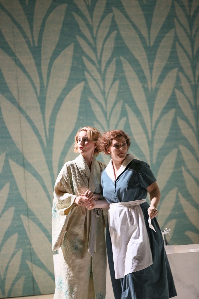 Dieser Interpretation entspricht passgenau auf der anderen Seite die Charakterisierung des Grafen Almaviva und seiner Frau. David Pichlmayers Graf Almaviva tritt stets im makellosen Dreireiher und mit der gelangweilten Noblesse eines von der Dekadenz nicht nur angehauchten Großadels auf. Die Verführung hübscher Zofen gehört bei ihm eher zur Imagepflege, als dass es einem unbeherrschbaren Begehren oder gar erotischer Zuneigung entspränge. Bei diesem Grafen hat man bisweilen das Gefühl, dass er sich auch ein Leben ohne die lästige Pflicht der erotischen Abenteuer vorstellen könnte, aber die Pflicht ruft halt. Ähnlich verhält es sich mit der Eifersucht gegenüber seiner Frau. Auch hier geht es ausschließlich um seinen Ruf als Adliger und Ehemann, der keinen Schaden leiden darf. Solange die Eskapaden seiner Frau nicht offenkundig werden, sind sie ihm gleichgültig, aber wehe, ein fremder Mann wird in ihren Gemächern gesehen. Dann muss er der lästigen Pflicht genügen, seinem Ehrgefühl Genugtuung zu verschaffen. In der Szene vor der verschlossenen Kammer, in der er – zu Recht – Cherubino vermutet, greift er denn auch nach einer endlosen Diskussion mit der Gräfin, die beiden viele und gern genutzte sängerische und schauspielerische Möglichkeiten einräumt, eher widerwillig zu durchgreifenden Maßnahmen.