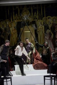 Der Chor ist in dieser Inszenierung ebenfalls vielfältig gefordert. Die unterschiedlichsten Volks-, Palast und Kerkerszenen sind sängerisch und darstellerisch zu absolvieren, und der Chor zeigt sich in all diesen Szenen auf der Höhe seines Könnens. Nicht zuletzt die Chormitglieder tragen entscheidend zu dem intensiven Gesamteindruck dieser Inszenierung bei.