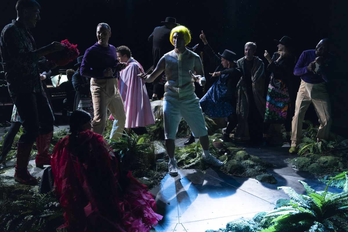 Vor dem Einlass begrüßt das erwähnte Bläserensemble das Publikum im Foyer mit einem barocken „Tusch“, und wenn die Besucher die Kammerspiele betreten, hat das Orchester bereits im Hintergrund der Bühne Platz genommen. Davor erstreckt sich ein grünes Gartenidyll mit einem – allerdings virtuellen – Teich in der Mitte. Einige Zuschauer an verteilten Plätzen tragen seltsame Kleidung, aber das bucht man unter modernem Nonkonformismus ab. Wenn dann das Licht erlischt und das Stück beginnt, entpuppen sich die seltsamen Zuschauer(innen) als Mitglieder eines Madrigalchors, der seine Kommentare zum Bühnengeschehen in stereophoner Art und Weise von der Tribüne aus singt, bevor er sich auf die Bühne begibt. Auch später werden diese Sänger(innen) sich wieder auf der Tribüne verteilen und damit einen“Rundum-Klang“ erzeugen.