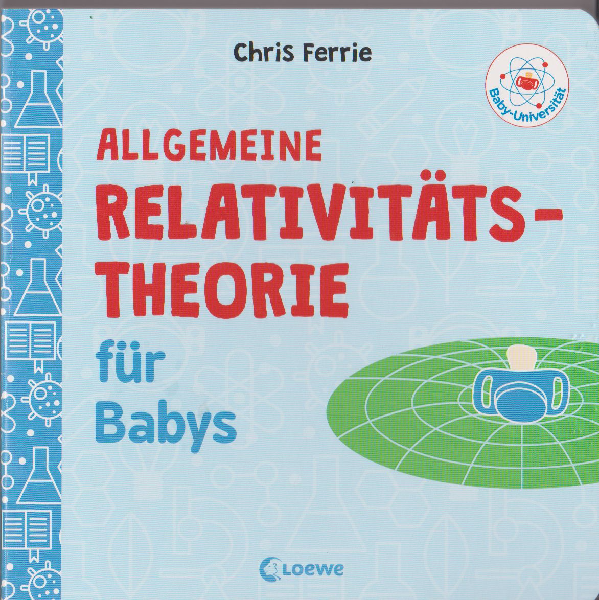Einsteins Relativitätstheorie widmet Ferrie das nächste Buch. Er erklärt sie so plausibel und einfach, dass auch Kleinkinder Zugang dazu erhalten. Wieder wählt er einen Ball, der mehr oder weniger Masse besitzt und den Raum – hier dargestellt durch ein zweidimensionales Netz – mehr oder weniger krümmt. Ein kleines Teilchen taucht auf und wird durch den gekrümmten Raum von seiner ursprünglichen Richtung abgelenkt. Ein drehender Ball zerrt am Raum, aber der Raum zerrt auch an der Masse. Ein Perspektivwechsel zeigt, wie die Masse den Raum krümmt. Wird nun die Masse stark verdichtet, mutiert sie zu einem „Schwarzen Loch“, dem wegen der starken Gravitation nicht einmal Licht entweichen kann. Wenn zwei Schwarze Löcher sich umkreisen, senden sie Gravitationswellen aus, die wiederum den Raum weiträumig dehnen und quetschen. So einfach ist das mit der Allgemeinen Relativitätstheorie!