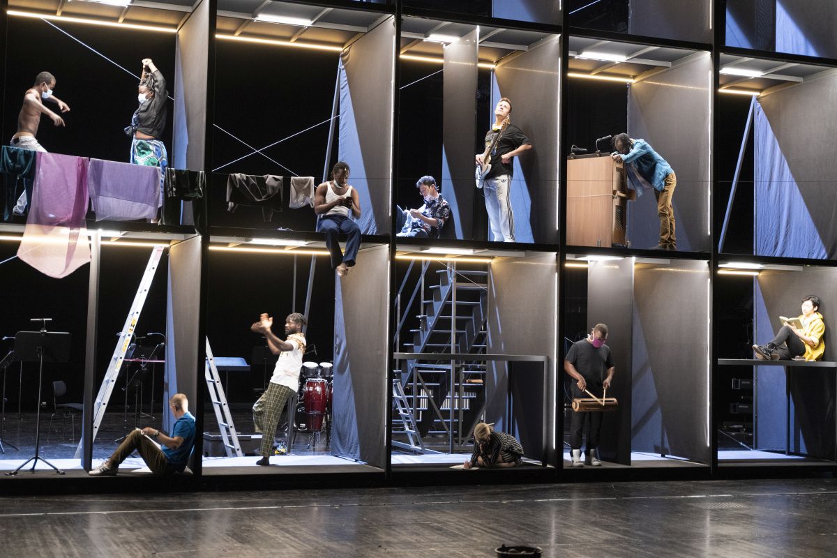 Der Abend beginnt mit einer Art „Setzkasten“ in Bühnenhöhe, der die Lebensumgebung einer ethnisch gemischten Gesellschaft wiedergibt, wobei der Schwerpunkt auf farbigen Bewohnern liegt. Einer trommelt leise auf seiner Trommel, der andere klimpert auf der Gitarre, ein dritter tanzt, eine Frau schlendert umher – kurz: es ist Alltag in einem multikulturellen Vorort. Wer jetzt die Katastrophe oder das Verbrechen erwartet, liegt falsch, denn hier wird der freie, unbeschwerte Alltag geradezu zelebriert. Alle „atmen“ befreit, um gleich den Titel dieser Performance aufzugreifen. Denn der Atem ist die Grundlage des Lebens, und ohne ihn endet alles tatsächlich in der Katastrophe.