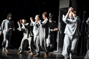 Spätestens jetzt schwenkt der bisher fast heitere Grundtenor ins Introvertierte, Klagende um, was durch das Umherirren eines einsamen Obdachlosen mit Discounter-Einkaufswagen noch betont wird. Es folgen verschiedene körpersprachliche Szenen, die wir nicht als Tanztheater bezeichnen wollen, weil sie kaum tänzerische Elemente, dafür aber ausdrucksstarke Körpersprache beinhalten. Die inhaltliche „Bedeutung“ der Szenen (Konzerne, Grenzen) lässt sich nur dem Programmheft entnehmen, was aber den Eindruck in keiner Weise mindert. Die Körper der Akteure bringen auch ohne semantische Erklärung Situationen und Ängste zum Ausdruck.