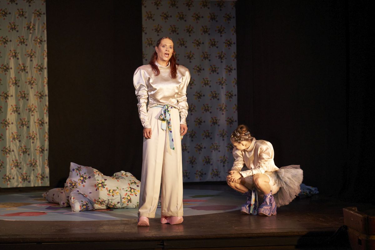 Die beiden Musikerinnen unterlegen das Bühnengeschehen von Beginn an mit so zurückhaltender wie prägnanter Kammermusik. Spiegelt diese anfangs noch das 19. Jahrhundert – es könnte Schubert oder Schumann sein -, so schreitet sie bald in die Moderne weiter, wenn Lena Sutor-Wernich ihre Lieder vorträgt. Deren Texte drehen sich, soweit man das nachverfolgen kann, stets um die Rolle der Frau. Da sie entweder in Französisch oder, wenn deutsch, dann in künstlerischem Stil gehalten und mit entsprechender Artikulation gesungen werden, sind sie nicht leicht zu verstehen. Doch auch ohne vollständiges Textverständnis erkennt man in jedem Lied dank der Ausdruckskraft der Sängerin das Leid und die Kritik an der Situation der Frau.