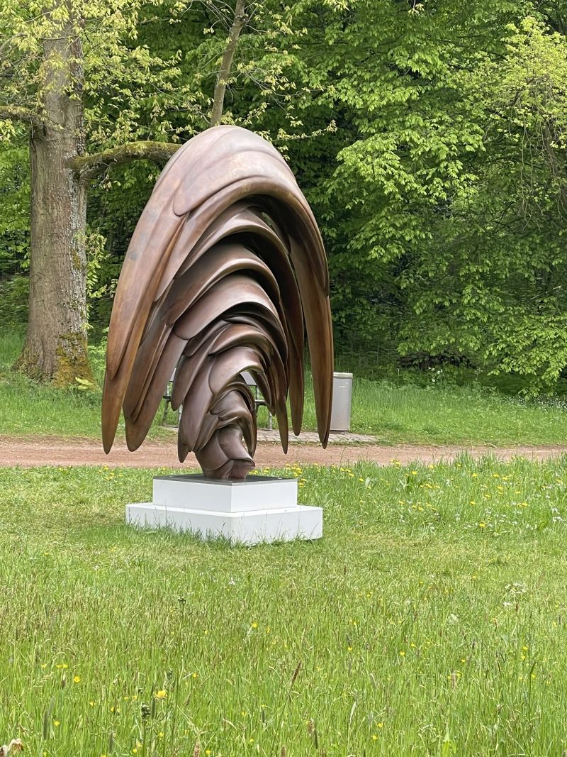 Weiter geht es zum Löwentor. Hier begegnen wir der schokoladenbraunen Plastik mit dem Namen „Stack“. Fest verwurzelt mit dem Betonsockel drängen auch hier verschachtelte Formen nach oben, aber auch in die Breite. Wer genau hinschaut, denkt vielleicht an geschichtete Fossilien, und auch menschliche Körperteile sind zu entdecken. Das Werk strahlt eine gebündelte Energie aus, die kaum zu bändigen ist.