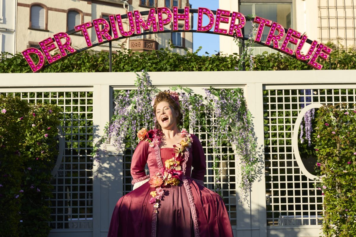 Den beginnenden Sommer nutzt das Staatstheater Darmstadt, sich und seinem Publikum einen Spaß zu gönnen. Was liegt da näher, als an die Musikfeste in den herrschaftlichen Zeiten des Barocks zu denken und diese Tradition – unter anderen Vorzeichen – neu zu beleben. Dazu hat man das Schäferspiel „Il trionfo della fedeltá“ der Barock-Komponisten und Wittelsbacher Prinzessin Maria Antonia Walpurgis (1724 – 1780) ausgewählt. Wie der bisweilen geniale Zufall es wollte, ist die Umkehrung ihrer Initialen M.A.W. als Reverenz zu verstehen, und man darf annehmen, dass die Dramaturgie des Staatstheaters das durchaus erkannt hat. Warum sonst würde die Herrscherin selbst am Schluss bei ihrem Auftritt wiederholt ihre Initialen deklamieren?