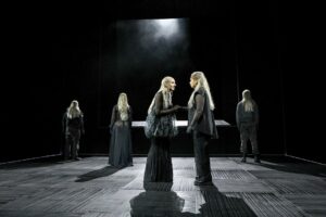 Anna Gschnitzers Beitrag zu dieser Inszenierung besteht offensichtlich in einem längeren Dialog zwischen Antigone und ihrer Mutter Iokaste, den es in Sophokles´ Text so nicht gibt. Hier werden typische Konflikte zwischen Mutter und Tochter verhandelt, und Antigone präsentiert sich hier als typisch rebellische Tochter, während Iokaste (Katharina Linder) all diese Reflexe und Aggressionen kennt und relativierend einzugreifen versucht, natürlich vergeblich.