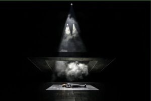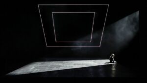 Regisseurin Selen Kara legt ihre Inszenierung darüber hinaus ganz im Sinne der antiken Tragödie an. Das von Lydia Merkel gestaltete Bühnenbild enthält nur zwei Elemente: eine etwas nach vorne gezogene, als solche markierte Spielplattform aus schwarzem Bühnenboden sowie einen großen Rahmen mit zurückhaltenden Leuchtelementen, der sich im Raum drehen kann. Zu Beginn bildet er den Rückraum, aus dem die Macht in Gestalt Kreons erscheint, und später senkt er sich geradezu bedrängend auf die lebendig begrabene Antigone nieder.