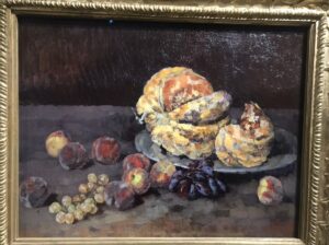 Ähnliches gilt für die Still-Leben, die er wie seine Zeitgenossen gerne aus Obst, Gemüse und Tischgeschirr zusammensetzte. Dabei spielten immer wieder die glänzenden Zinngeräte oder spiegelnde Gläser eine Rolle, konnte man an ihnen doch Lichteffekte am besten aufzeigen. Doch auch die Obststücke, gerne auch aufgeschnitten, waren ein gerne gewähltes Sujet, an denen man eine geradezu haptische Wirkung der farblichen Darstellung erzielen konnte. So findet man in der Ausstellung einige Male mehrere Bilder mit demselben Titel und nur geringen Abweichungen und erkennt daran, wie intensiv Schuch an seinen Kompositionen arbeitete.