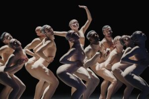 Die Choreographie beginnt fast lyrisch mit Vogelgezwitscher und einer rituell anmutenden Szene, bei der das gesamte Ensemble in der Bühnenmitte in enger Gemeinschaft die Arme gen Bühnenhimmel richtet. Schon hier stellte sich beim Rezensenten spontan die Assoziation an Strawinskys „Le Sacre du Printemps“ ein, und der weitere Fortgang der Choreographie bestätigte diese Reminiszenz noch. Die Nacktheit verstärkt den mythischen Aspekt, ebenso die ostinate Musik von Ori Lichtik, die sich aus den endlosen Wiederholungen der „minimal music“ und der Techno-Musik speist. Auch die distanzierten musikalischen Figuren Debussys spielen mit hinein. Die wohldosierte Lautstärke und Dynamik dieser Musikmixtur erzeugt eine endlos vorwärtsdrängende Dynamik, die den menschlichen Pulk auf der Bühne geradezu zum Gehen und Laufen zwingt.