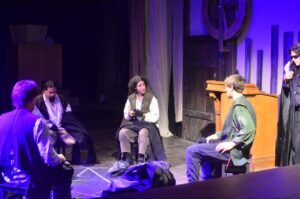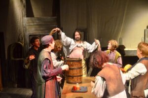 So auch in dem Roman „Krabat“, den die Arheilger „Neue Bühne Darmstadt“ jetzt unter der Regie von Renate Renken als Theaterstück inszeniert hat. Die Handlung spielt Anfang des 18. Jahrhunderts im Gebiet der Sorben irgendwo zwischen Elbe und Oder. Viele verarmte junge Burschen zogen auf der Suche nach Arbeit durch die Lande und verdingten sich auch bei zweifellhaften Arbeitgebern. So gelangt der junge Krabat (Mike Brendt) an eine geheimnisvolle Mühle, wo der sogenannte „Meister“ (Rainer Poser) das Regiment über mehrere Gesellen und das Mahlwerk ausübt. Krabat erhält als Neuling die undankbarsten Aufgaben und gleich zu Beginn die Warnung, sich nicht mit Mädchen einzulassen. Unter seinen Kameraden fällt Lyschko (Axel Raether) als bösartiger, aber letztlich feiger und liebedienerischer Intrigant auf, während der Koch Juro (Dominik Kaiser) nur den Einfältigen spielt, um nicht aufzufallen. Nur Tonda (Maximilian Friedel) steht dem Neuling mit Rat und Tat zur Seite und beschützt ihn vor Lyschkos Ausfällen.