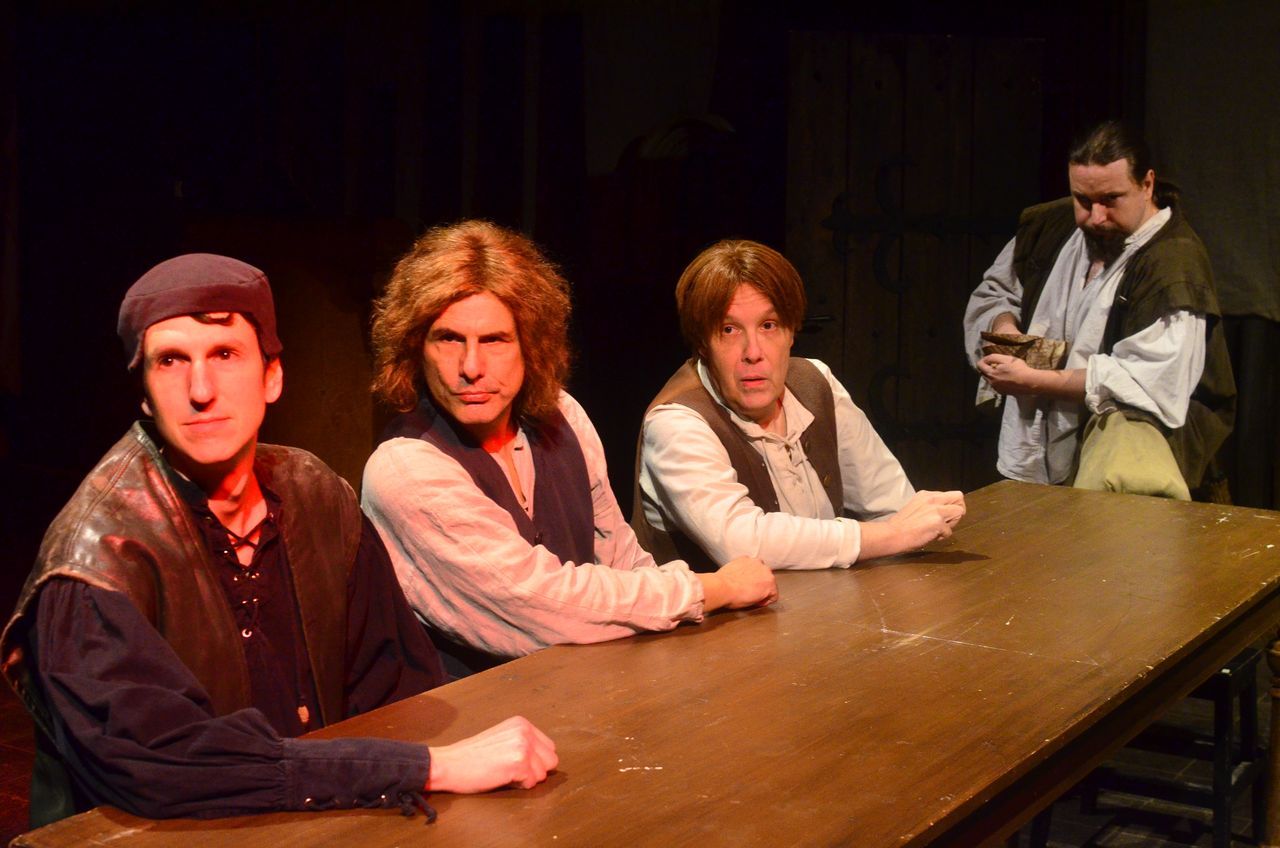 Wir wollen den Ausgang hier nicht verraten und uns daher auf die Details der Inszenierung konzentrieren. Elena Schöck hat die Gesellen mit einfachen Kostümen einer vergangenen Zeit ausgestattet, für die die Bezeichnung Wams sich geradezu anbietet. Der Meister tritt natürlich im schwarzen Anzug des Magiers auf, und von Zeit zu Zeit schwirren alle Gesellen mit schwarzen Rabenköpfen und ebenso schwarzen Umhängen drohend krächzend durch den Saal. Dem Ensemble gelingt es auf beeindruckende Weise, das angstgeprägte Leben des einfachen Volkes nach dem Dreißigjährigen Krieg wiederzugeben. Man sitzt um den Tisch, schaufelt das knappe Essen in sich hinein und versucht, sich möglichst unsichtbar zu machen. Sehr gut arbeitet die Regie auch das typische Verhalten in totalitären Systemen heraus. Axel Raether gibt den nach oben buckelnden und nach unten tretenden Lyschko als aggressiven Psychopathen, Dominik Kaiser verleiht dem unsichtbaren Mitläufer Juro die Bauernschläue des um sein Überleben Kämpfenden, und Maximilian Friedels Tonda ist der einzige, der unter dem Schreckensregime des Meisters seinen Wertekatalog nicht verrät – und dafür stirbt. Reiner Poser spielt den Meister als unnahbaren und gerade deswegen allmächtigen „Führer“, und Vivien Pantea Seifert ist als unschuldig Liebende seine unwissende Richterin und vertritt damit den märchenhaften – und leider unrealistischen – Part dieses Stücks.