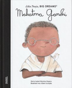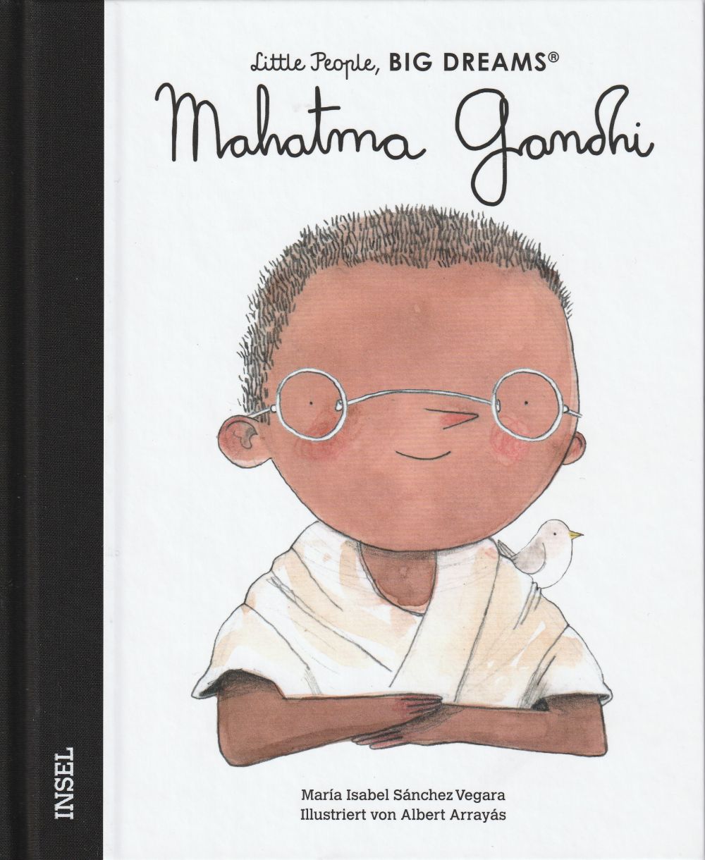 Beim Aufschlagen des Buches begegnet uns gleich die Friedenstaube bei verschiedenen Flugübungen. Fröhlich segelt sie über die ersten Buchseiten, Dann begegnet uns der kleine Mohandas mit großer, runder Nickelbrille. Die Friedenstaube sitzt auf seiner Schulter. Schon früh bildet sich sein friedlicher Charakter heraus. Er möchte, dass alle Lebewesen friedlich und hilfsbereit miteinander leben. Durch diese innere Motivation angetrieben, studiert er später Jura, um Anwalt zu werden. Seine erste Stelle bekommt er in Südafrika.